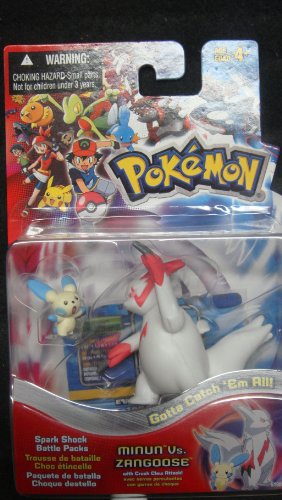 Pokemon Minun Vs. Zangoose with Crush Claw Attack!GOTTA CATCH'EM ALL!Spark Shock Battle Packs! Minun:Type- ElectricHeight: 1'4"Weight: 9 lbs. Crawdaunt:Type- NormalHeight- 4'3"Weight- 89 lbs. Evolution Card Included! AGES 4+WARNING: Choking Hazard- Small parts. NOT FOR CHILDREN UNDER 3 YEARS.